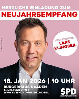 Der SPD-Kreisverband Altenkirchen lädt gemeinsam mit den beiden Landtagskandidaten Sabine Bätzing-Lichtenthäler, MdL, Wahlkreis 1 Betzdorf/Kirchen, und Philip Schimkat, Wahlkreis 2 Altenkirchen, am Sonntag, den 18. Januar 2026, um 10 Uhr, zum traditionellen Neujahrsempfang ins Bürgerhaus Daaden ein.